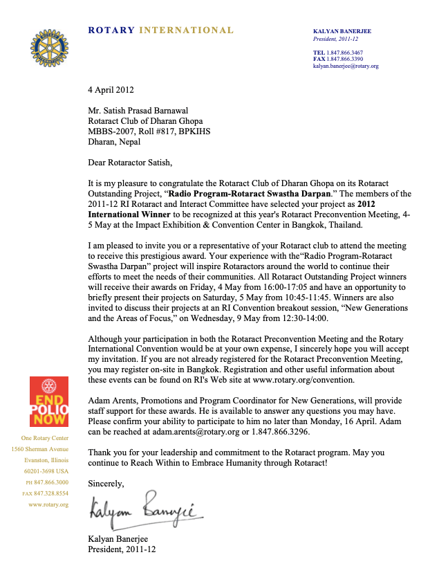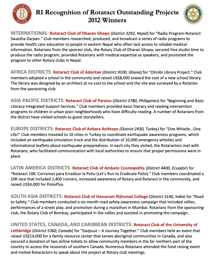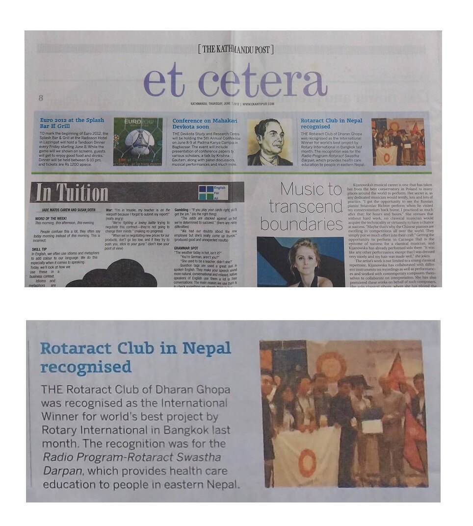 International Winner of Rotary International Recognition of Rotaract Outstanding Project 2012 for Radio Program – Rotaract Swastha Darpan, presented during the Rotaract Preconvention Meeting, Bangkok, Thailand.