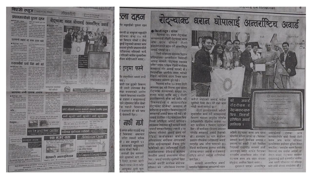 The Rotaract Club of Dharan Ghopa carried out the project “Radio Program – Rotaract Swastha Darpan.” Club members researched, produced, and broadcasted a series of radio programs via Star FM located in Dharan, Nepal once every two weeks that provided health care education to people in eastern Nepal, many of whom lacked access to reliable medical information.